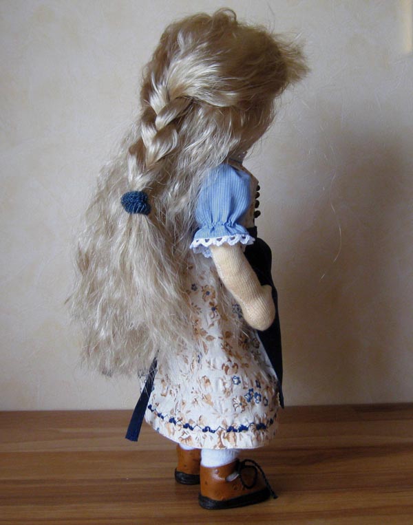 Ich habe Lederschuhe, weiße Söckchen, eine Batistbluse, ein Baumwollkleid und eine Schürze an