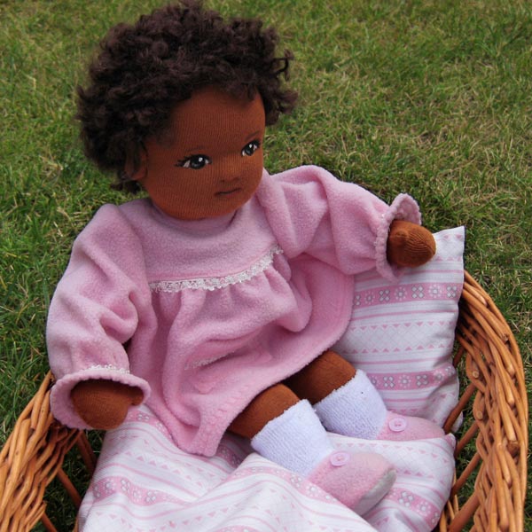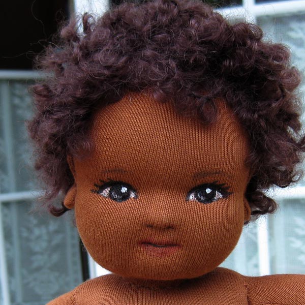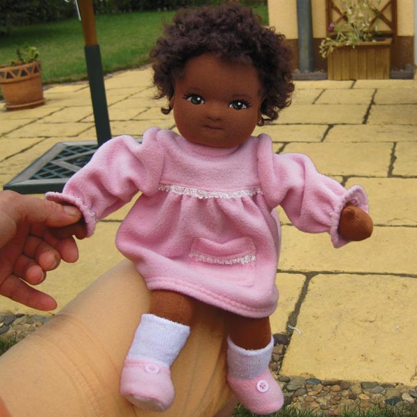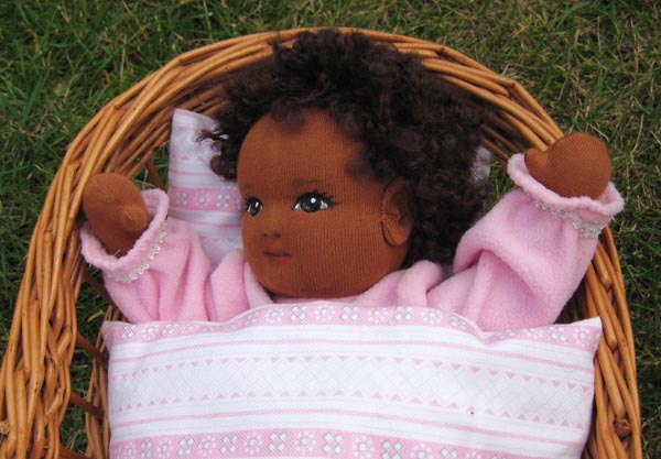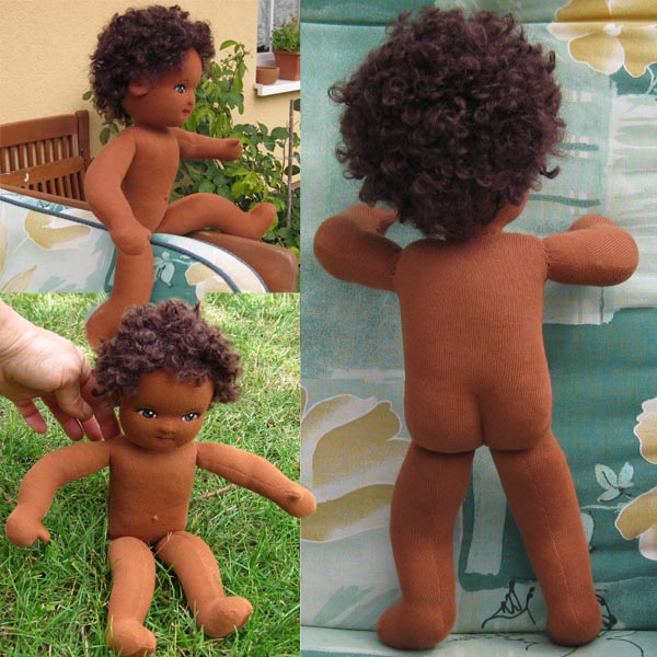 ein 37cm großes Puppenbaby, mein Köpfchen ist ganz aus Stoff und mit Schafwolle gefüllt, meine Löckchen aus Bouclè Mohairgarn.