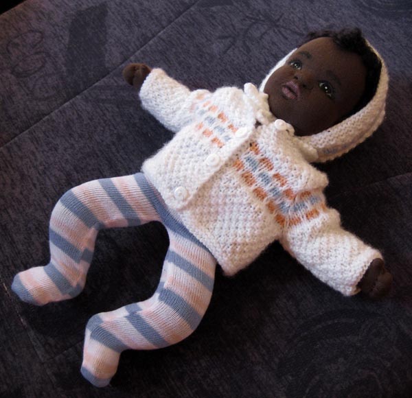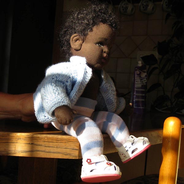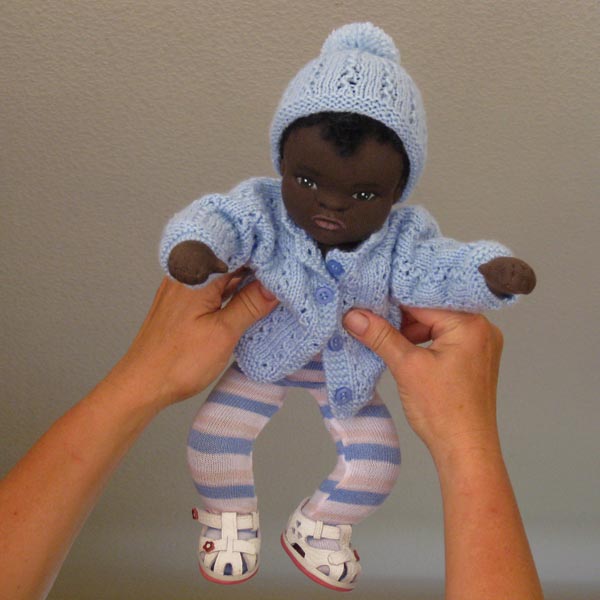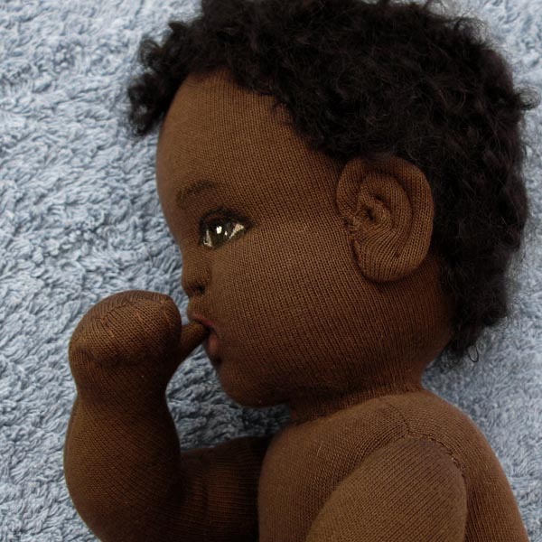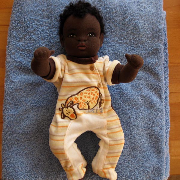 ein braunes Puppenbaby, 37cm groß, mein Gesicht ist mit Textilfarbe aufgemalt, mein Köpfchen ist ganz aus Stoff und mit Schafwolle gefüllt. Meine Löckchen sind aus Bouclé Mohairgarn aufgenäht. Mein Körper ist mit Schafwolle und Sand gefüllt, darum bin ich schön schwer und anschmiegsam.