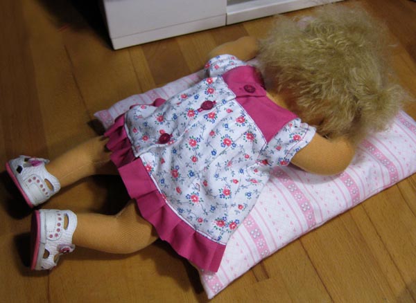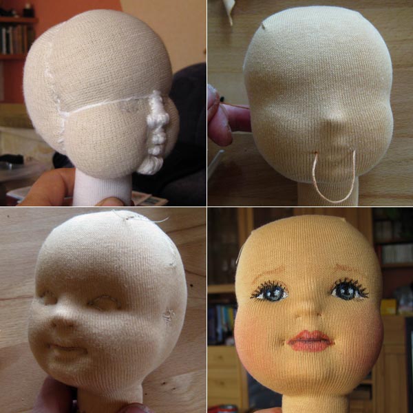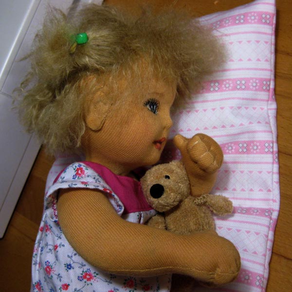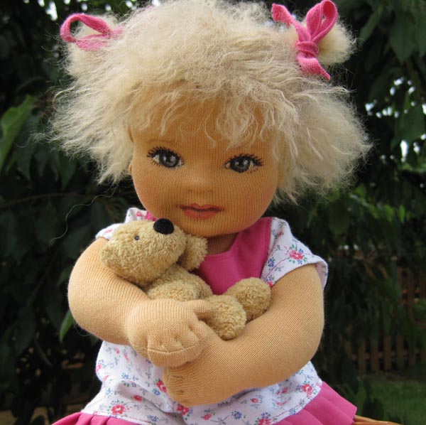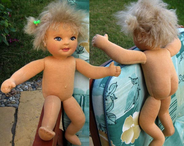 ein 40cm großes Puppenbaby, mein Köpfchen ist ganz aus Stoff und mit Schafwolle gefüllt, meine Haare sind aus Mohairfell von Pummbären, ehemals weiß, mit Walnuss- und Zwiebelschalen blond gefärbt.