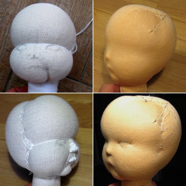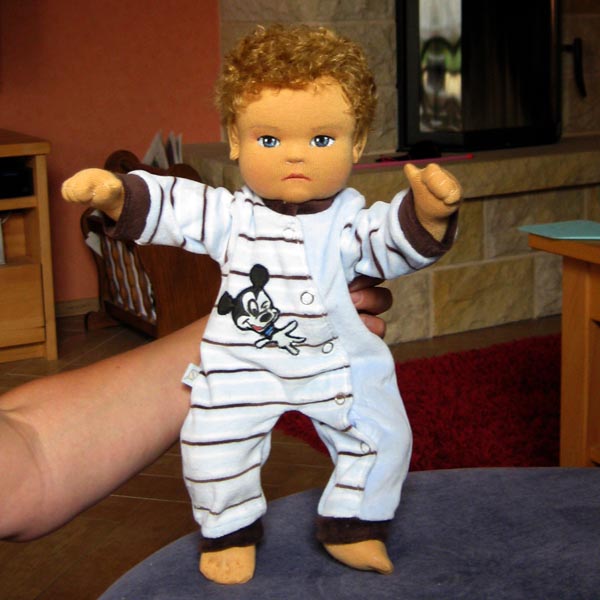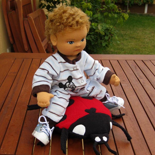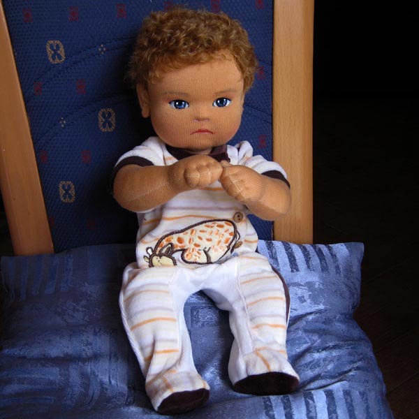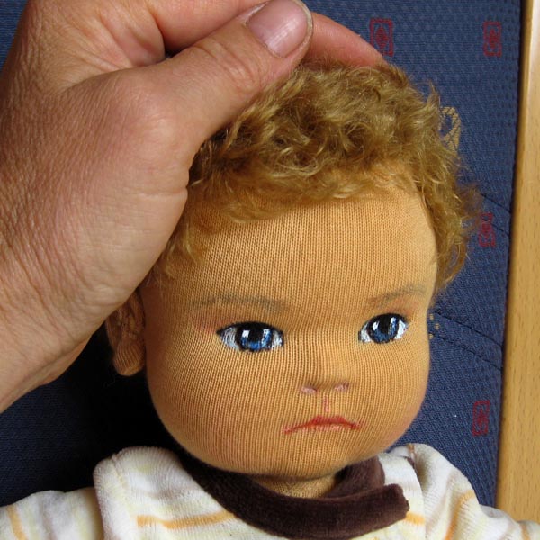 ein 39cm großes Puppenbaby, mein Köpfchen ist ganz aus Stoff und mit Schafwolle gefüllt mit Löckchen aus Mohairfell.