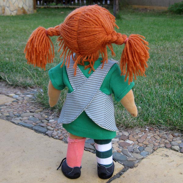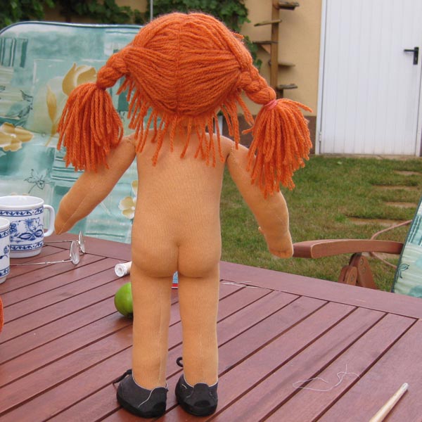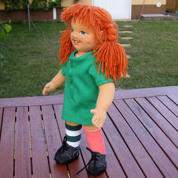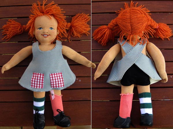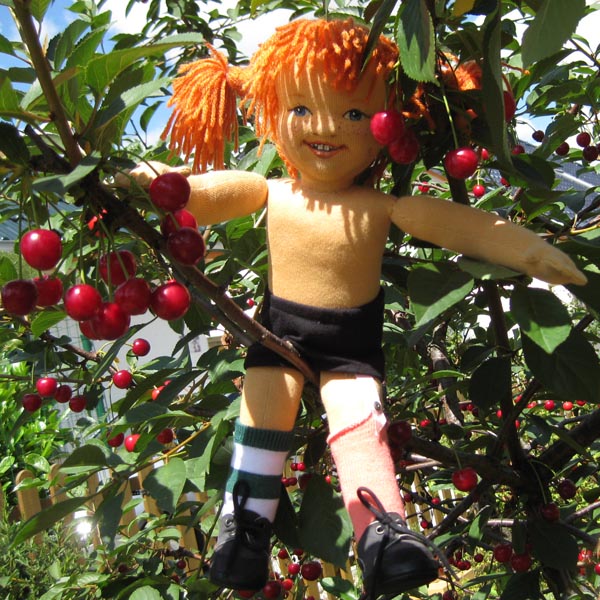 ein 37 cm freches Puppenkind, meine Gesicht ist mit Textilfarbe aufgemalt, vorher abgebunden und in Form gestickt. Meine karottenroten Haare sind aus Wolle aufgestickt und zu Zöpfen geflochten. Auf meiner Schulter sitzt Herr Nilsson.